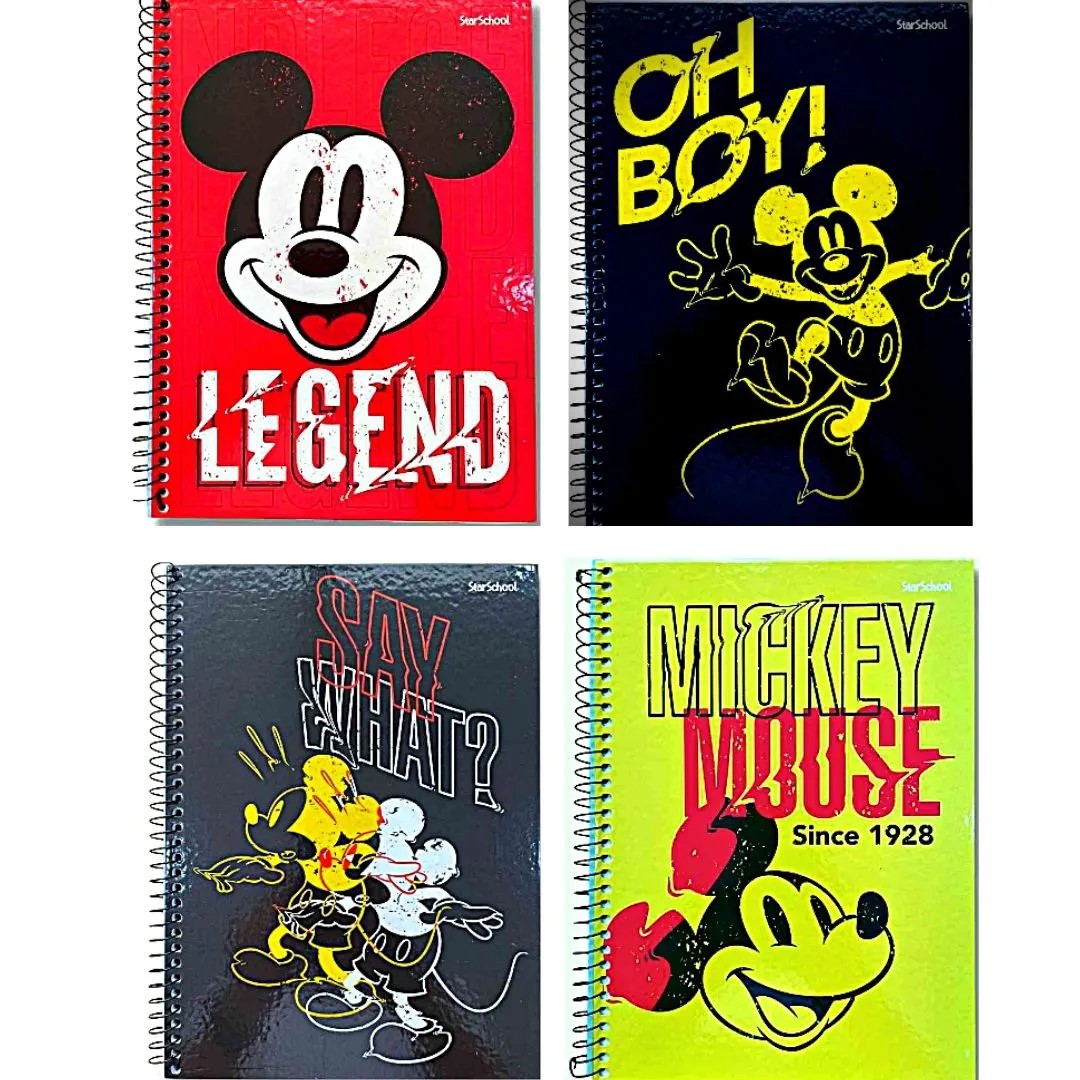 CADERNO ESPIRAL 1/4 CAPA DURA MICKEY, 80 FOLHAS, MIOLO PADRÃO , 4 MODELOS DE CAPA.